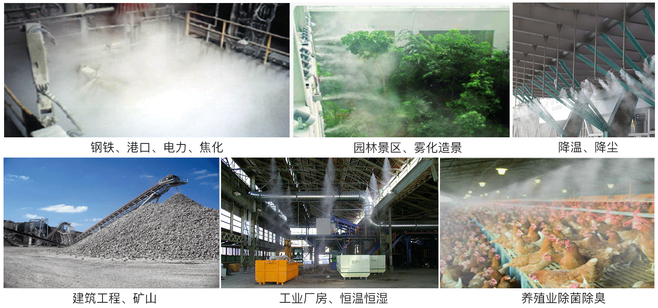 应用领域:电力、港口、 金属矿山、施工工程、砂石骨料、垃圾除臭、化工、钢铁冶炼、食品、园林景观等。改善作业环境,避免对身体带来不适感,提高生产水平和生产质量。